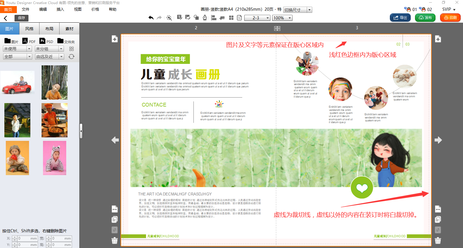 2.然后,保证文字和图片内容放置在版心区域内,如下图所示: